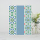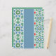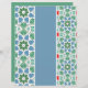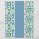 Dekorative Fliesen mit geometrischen Mustern in Blau und Grün werden durch einen soliden, hellblauen vertikalen Streifen getrennt. Die Fliesen sind mit Stern- und Diamantformen umgeben von Punkten gestaltet, die dem Gesamtdesign eine mosaikähnliche Qualität verleihen.