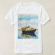 The boat is reflected in the calm blue water, creating a colorful reflection.