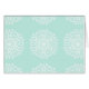Dieses weiße Mandala liegt auf einem hellblau-grünen Hintergrund. Die Farben sind ruhig und kreativ. Teil der Sammlung Mola Mandala.