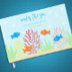 Babydusche mit orangefarbenen und blauen Fischen inmitten eines Sandriffs aus Korallen und Algen inmitten von Meeresblasen.