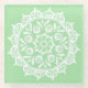Dieses weiße Mandala sitzt auf einem weichen grünen Hintergrund. Die Farben sind ruhig und kreativ. Teil der Brosya Mandala Kollektion.