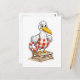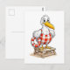 A humorous seagull lifeguard wearing a vintage swimsuit and holding a rescue buoy stands proudly at the beach. This comic-style illustration blends coastal charm with playful character design, perfect for fans of quirky seaside art, nautical humor, and whimsical bird characters.