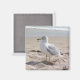 Ein Magnet, der aus einer Fotografie von einer Florida-Möwen-Pose im Sand des Strandes entstanden ist, während die Wellen ruhig einrollen.