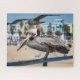 Schönes California Brown Pelican posiert für sein Portrait auf dem Pier in Huntington Beach, CA, nur um von Seagull fotografiert zu werden.