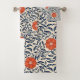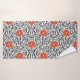 Seamless floral pattern with vibrant orange flowers and navy blue leaves on a beige background, creating an ornate, symmetrical design.