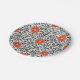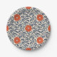 Seamless floral pattern with vibrant orange flowers and navy blue leaves on a beige background, creating an ornate, symmetrical design.