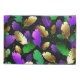 Seamless pattern of bright purple, green, and gold feathers on black Mardi Gras background. Design for the Mardi Gras holiday.