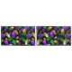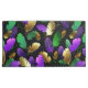 Seamless pattern of bright purple, green, and gold feathers on black Mardi Gras background. Design for the Mardi Gras holiday.
