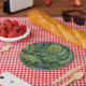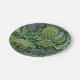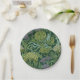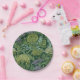 Seamless William Morris style wallpaper pattern featuring dense green foliage and large, rounded flowers in shades of lime green, off-white, and muted lavender against a dark emerald background.