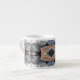 Dieses Kunstwerk auf diesem Espresso Cup wurde aus einem Originalfoto von HomeWare von Muscheln gemacht. Es ist ein Foto von mehreren Muscheln in hellem Sonnenlicht und Schatten. Die Muscheln sind Konkaden und andere Sorten, meist weiß und cremefarben, aber eine mit hellen Lachsfarben im Inneren der Muschel und eine mit schwarz-weißen Streifen. Es gibt viele komplizierte, kurvige Formen in der Gestaltung aus dem Foto der Muschel. Der Gesamteindruck des Musters ist in warmen Grautönen und Weiß gehalten, mit einem Hauch von hellrosa Lachs.