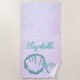 Handtuch mit aquamarinen Muscheln und einem Lavendel lila Aquarelluntergrund