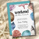 Beach Wochenende Junggeselinnen-Abschied Einladung, gerahmt mit Aquarellmuscheln und Meereslebewesen. Das "Wochenende am Strand" wird von Hand geschrieben und der Rest ist vollständig editierbar.