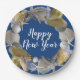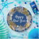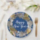 Individuelle Teller zum Thema Strand für jeden Anlass. Dunkelblau mit hübschem Muschelkranz um den Rand und modernem Schriftart in der Mitte. Beispieltext ist "Happy New Year" und kann leicht für einen Geburtstag, Abschluss, Polterabend oder Sommerevent geändert werden.