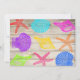 Die Karten sind mit Seestern, Kamelen und Zapfen in Rot, Blau, Gelb, Grün, Rosa, lila und Orange versehen, die mit einem braunen Beispieltext auf einem Hintergrund aus Imitat und Holz verziert sind.