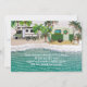 Camping Christmas greeting cards with beach design. Two campers, a trailer and Class B drivable RV, are parked among palm trees and next to the ocean. Add your personal holiday message, in white script, over a background of turquoise sea water. Typical of campsites near the water, campers share the views in close proximity. These flat cards have a pattern of sand snowmen and palm trees on the back. This design can also be purchased as an instant download and shared digitally.