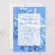 Blaue Hochzeitseinladungen mit Seestern und Hydrangea Blume Design. Text beginnt, "Gemeinsam mit unseren Familien (oder Eltern)" mit den Namen des Paares in elegantem Skript. Der blaue Text wird auf einem weißen Feld gedruckt, die große blaue Blume dahinter. Der große, weiße Seestern macht dieses Design perfekt für eine Hochzeit oder eine Feier am Meer.