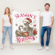 A festive and cheerful Christmas holiday design showcases a skeleton wearing a Santa hat, reading a book, and holding a steaming cup of coffee. Surrounding him are poinsettias, holly berries, and pine tree branches. The colorful text says: "Season's Readings." This design is available on a variety of products, making it the perfect gift for book lovers.