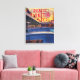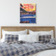 Ein Abend-Stadtbild zeigt das Symbol des öffentlichen Marktzentrums in Seattle, Washington. Das Schild ist mit leuchtend roten Neonbriefen beleuchtet, die sich dem warmen Himmel des Abends gegenüberstellen.