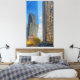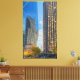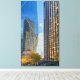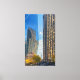 Dieses Bild zeigt ein lebendiges Stadtbild mit moderner Architektur in Seattle. Ein beeindruckender blauer Wolkenkratzer aus Glas mit einem einzigartigen geometrischen Design spiegelt die umliegenden Gebäude und den Himmel wider. Neben dem Hotel befindet sich ein helleres Gebäude mit senkrechten Fensterlinien, das die urbane Landschaft noch vertieft.
