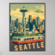 Eine faszinierende Postkartenillustrierung im Vintagen Stil, die den Charme und Charakter von Seattle, Washington, wiedergibt.