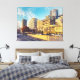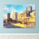 Das Bild zeigt ein lebendiges Stadtbild von Seattle mit einer Mischung aus modernen und älteren Gebäude. Im Vordergrund befindet sich eine Straße mit geparkten Autos und ein paar Fußgängern, während der Hintergrund von mächtigen Strukturen dominiert wird. Die Gebäude sind vorwiegend in Gelb und Beige gehalten, mit großen Fenstern und Balkonen. Der Himmel ist klar blau mit flauschigen weißen Wolken, was auf einen sonnigen Tag hindeutet