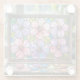 Ein Kunstwerk aus Buntglas, das sechs Blume aus lebhaften Hibisken darstellt, die in einem Mosaikmuster angeordnet sind. Die Blüten zeigen eine atemberaubende Palette von rosa, blau, rot, lavender und lila Farbtönen, jede Blüte mit einem subtilen Farbverlauf. Sonnenlicht strömt durch das Glas und gießt farbenfrohe Muster auf einer rustikalen Holzoberfläche unter dem Blumendisplay, als weiches, diffuses Glühen beleuchtet die Szene. Der Untersetzer ist ein Untersetzer aus viereckigem Glas, der als Geschirrspüler dient.