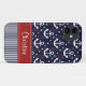 Dieses kundenspezifische Marineblau- und -WEISSankermuster mit Streifen, Herzen und einem Polkapunktmuster kann mit Ihrem Namen auf dem DRUCKrot und Weiß genähten dem Bandblickentwurf personalisiert sein. Statten Sie Ihr Lieblingsgerät mit diesem preppy und stilvollen inspirierten nautischentwurf aus. Dieses macht ein niedliches Geschenk für, jugendlich oder jedes girly Mädchen der Frauen, Ehefrau eines Kapitäns. Grafik © Chrissy H. Studios, LLC. Alle Rechte vorbehalten.