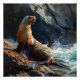 Eine digitale Abbildung eines Seelöwen, der sich faul am Felsrand putzt.