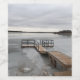 Ein Flaschenlabel mit einem Foto gefrorener Docke auf einem gefrorenen See.