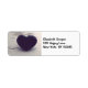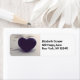 Ein Stillleben Foto eines seelenvollen, lila Steinherzes, das auf einem Sandstrand sitzt.
