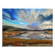 Ein Kunstdesign eines Sees mit dem dramatischen Himmel, der sich im Wasser des Sees widerspiegelt. Berge und Felder umgeben den See.