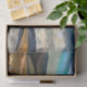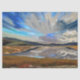 Ein Kunstdesign eines Sees mit dem dramatischen Himmel, der sich im Wasser des Sees widerspiegelt. Berge und Felder umgeben den See.