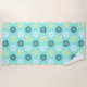 Strandtuch mit einem lustigen ozeanischen inspiriert Muster von Blume aus kleinen Seepferden in weiß, gelb und dunkel aqua auf einem hellen Hintergrund.