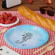 Papier Teller mit einer schwarzen Farbskizze eines Seepferds und einer Muschel. Der Hintergrund ist eine hübsch blaue Aquarelltextur.