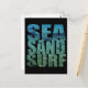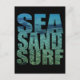 Schwarze Postkarte mit den Worten "Meer-Sand-Surf" mit tropisch türkisfarbenem Wasser und Korallen.