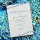 Blue Sea Stars Polterabend Einladung mit modernem Drehbuch und gedruckten Schriftart. Kleine blaue Seesterne machen diagonale Reihen oben und unten von hellgrauen sandfarbenen Einladungen. Benutzen Sie diese Vorlage für eine Dusche oder eine Verabredung, oder auch für ein Abendessen in der Probe.