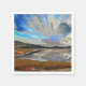 Ein Kunstdesign eines Sees mit dem dramatischen Himmel, der sich im Wasser des Sees widerspiegelt. Berge und Felder umgeben den See.