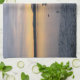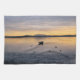 Ein alleines Boot wird durch die abgehenden Gezeiten angeschwemmt, während eine Menge der Seevögel auf den Salzwassergeschenken füttern, die hinten mit einem Hintergrund der Sonne verlassen werden, die über die San- Juaninseln in Washington-Staat einstellt.