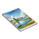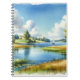 Das ist ein Notebook, das eine Aquarelldarstellung eines Segelbootes auf einem See hat.