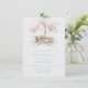 Aquarell Segelboot mit Muscheln, Korallen und weich grün und rosa Blätter auf einem Imitat, sehr heller Hintergrund. Die Rückseite ist ein staubblauer Hintergrund. Ideal für eine Hochzeit mit einem Strand, Meer, See, tropischen oder nautischen Gefühl oder einer Hochzeit in Urlaubsort.