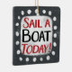 "Sail A Boat Today" ist ein niedliches Textdesign in Grau mit schwarzem und rotem Text. Er sitzt auf einer weißen Akzent-Form und niedliche weiße Polka-Punkte, die ihn umgeben.