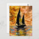 ein traditionelles Aquarellwerk mit einem Segelboot, das unter einem farbenfrohen Sonnenuntergangshimmel über den Ozean treibt und auf einer Postkarte im Meer reflektiert wird.