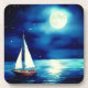 Untersetzer in einer Illustration eines Segelbootes, das friedlich auf einem ruhigen, mondbeleuchteten Meer treibt, umgeben von einem Sternenhimmel. Der Vollmond reflektiert das Wasser sanft und schafft eine ruhige und ruhige Szene.