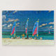 Dieses Rätsel enthält drei Segelboote, Katamarane, an einem weißen Sandstrand. Wenn du nicht in den Urlaub fahren kannst, ist das das Beste.