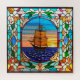 Ein buntes Glaskunstwerk, das ein majestätisches Segelschiff gegen einen pulsierenden Sonnenuntergang darstellt. Das Wassersportzentrum wird durch die vielfältigen, blumigen und geometrischen Muster umgeben, die Kunst und Meereskunst miteinander verbinden.