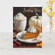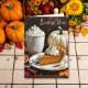 Hübscher Fall Thema Grußkarte Sprichwort, "Senden Sie Ihre Herbstsegmente" für einen Freund oder ein Familienmitglied. Eine helle Illustration einer leckeren Herbstszene mit einem Kürbiskuchen und Sahne auf einem extravaganten Vintagen Teller, einer Tasse heißen Kakaos mit Kürbiscreme und einem weißen Kürbis, umgeben von Zimtarsticken und getrockneten Orangenscheiben.