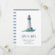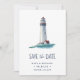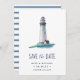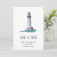 Elegante Küstenwache speichern die Dattelkarten mit einer Aquarellbilderung eines Leuchtturms in Marinefeld, Rot und Weiß auf einem aquamarinen Meer, oben "Save the Date" und Ihre Hochzeitsdetails in nautisch marineblau blau Schrift.