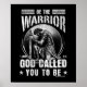 Das Design zeigt einen mächtigen Krieger mit Rüstung verkleidet, kniend mit seinem Kopf in Ehrfurcht und Gehorsam gegenüber Gott verbeugt. Der kühne Text unter dem Bild lautet: "Sei der Krieger, Gott rief dich zu sein", inspiriert durch 1 Johannes 5:4, und betont die Kraft und den Sieg, die durch den Glauben an Gott entsteht.