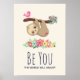 Ein Poster mit einem amüsanten Sprichwort: Be You the world will sich anpassen. Entworfen mit einer Illustration eines niedlichen braunen Hangs, der auf dem Kopf hängt. Dieser lustige kleine Typ hält an einem Ast fest, der auf der einen Seite einen kleinen rosa Vogel und auf der anderen Seite einen Rosenbuket im Doodle-Stil hat. Unter ihnen ist eine Anordnung von bunten, handgezeichnet Blume. Dieser bezaubernde Faultier hat auch rosa rosa, rosa Wangen und 3 niedliche kleine Herzen auf seinem Hintern.