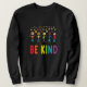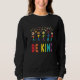 Sei Kind Design besteht aus einer gemischten Gruppe von vielen Leuten über der Nachricht "Sei Kind" in Regenbogenfarben. Ein ethnisch vielfältiges Bild, um Freundlichkeit unter allen Menschen zu suggerieren und zu unterstützen.